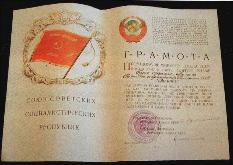 | Грамота Президиума Верховного Совета СССР о вручении боевого знамени ГСН КГБ СССР "Вымпел" . |