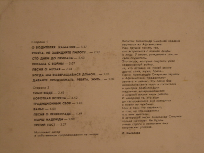 | В 96-м году ,когда уезжал с Дальнего Востока,братишки-афганцы на перроне подарили винил А.Смирнов Короли камуфляжа.У меня проигрывателя нет,а у родственников и знакомых-"эпидемия"-у всех попропадали иглы или головки звукоснимателей.Так и лежит пластинка,ни разу не прослушана.Вот некоторые названия песен:Короли камуфляжа,Кровавые игры,Вопрос,Вольная охота,Родные слова,Памяти В.И.Никонова.Помогите ,пожалуйста,найти песни с данного диска.Или другие песни А.Смирнова.