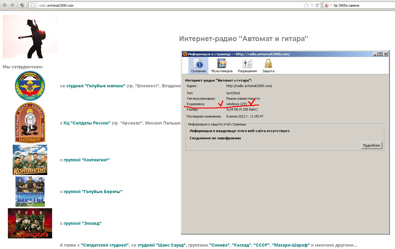 В виду проблем с кодировкой на странице нашего интернет-радио у отдельных пользователей выкладываю здесь скриншот. На нем видно, что страчника интернет-радио выдается сервером в кодировке Windows-1251. В связи с этим, у кого отображаются непонятные символы, рекомендация установить в своем браузере автоопределение кодировки, либо принудительно выставить Windows-1251.
