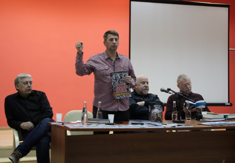 в рамках литературного марафона по городам боевой славы 2015г. 2-3 декабря состоялись встречи петербургских писателей с псковскими читателями.Форум был организован областной библиотекой.Делегацию возглавил Николай Николаевич Прокудин-автор романа "Постарайся вернуться живым",за который получил премию Н.Гоголя в 2004 году.Постоянный автор сайта http://artofwar.ru/ Взяв слово первым,Николай Прокудин упомянул о некоторых организационных вопросах,которые привели писателей "в пункт назначения" в ноябре-декабре вместо запланированного сентября.Банальное "никому нафиг не надо",коротко говоря... В состав "писательского десанта" также вошли поэт Олег Левитан,уроженец деревни Новоселье Псковской области,прозаики Петр Котов(Могунов) и Александр Чесноков.Петр Могунов рассказал историю написания романа "Мимо острова Буяна"-об эпизоде ВОВ на острове Борнхольм.На форуме были представлены альманахи "Сто лет дорогами войны" и "Северное измерение"(посвящен году литературы) Книги были переданы сети городских библиотек.